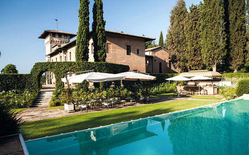 Das ehemalige Kloster ist heute eine romantische Hochzeitslocation. Es bietet einen Rundumblick auf die Hügellandschaft der Toskana, sowie auf das Städtchen San Gimignano.